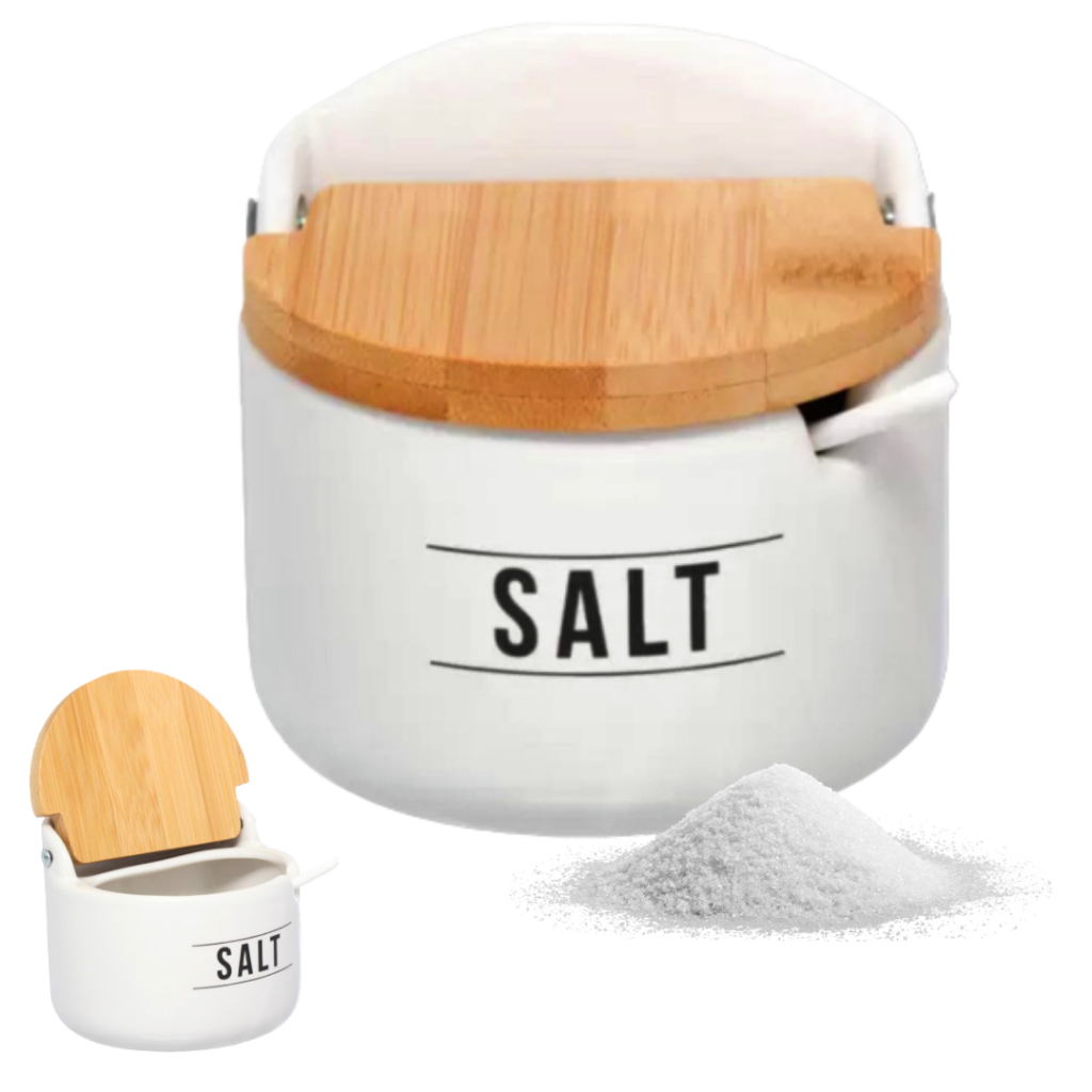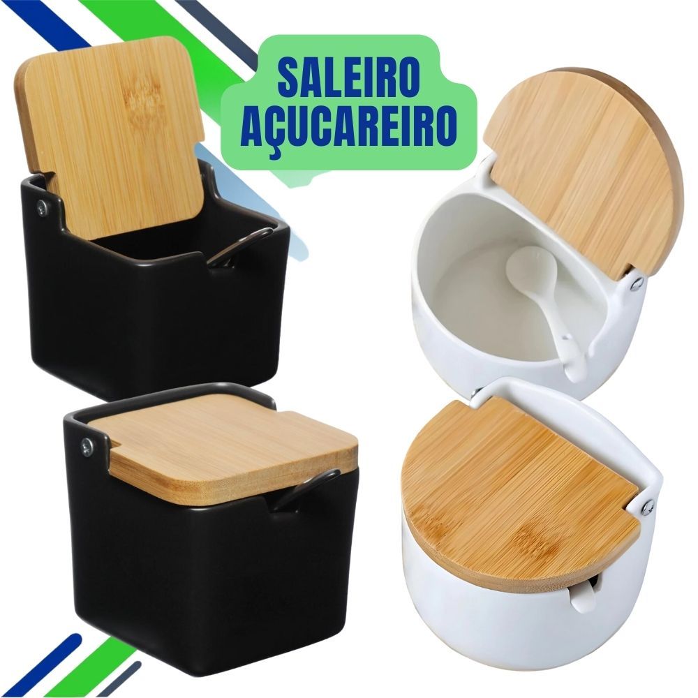 Saleiro de Cozinha / Galheteira Cêramica/Porcelana de Mesa Com Colher Porta Condimento Preto ou Branco com Tampa de Bambu para Decoração de Casa