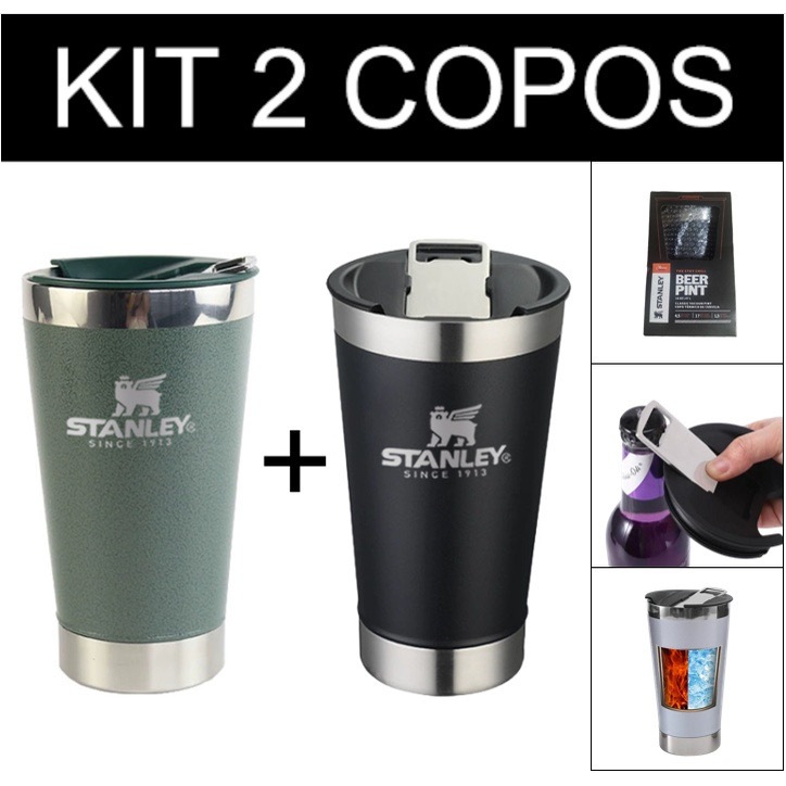 kit com 2 copos Stanley térmico para cerveja inox quente e frio com tampa e abridor