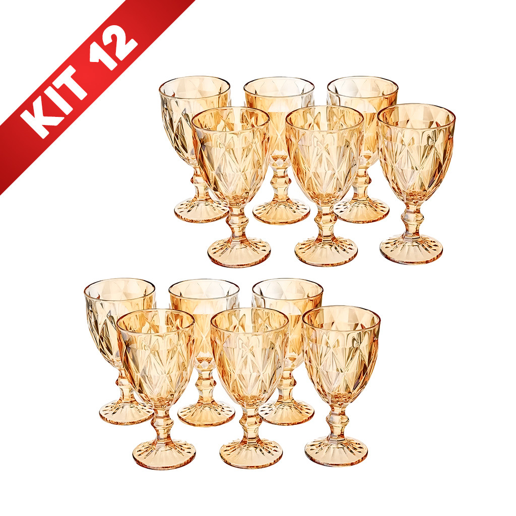 Kit 12 Taças 310ml Vidro Diamond Vinho Água Drinks Ambar Dourada Metalizada Jogo Cozinha Suco Copo