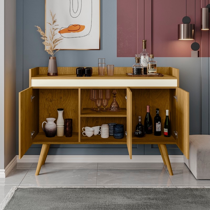 Aparador 3 portas buffet sala balcão escritório com prateleira e pés de madeira cor mel com off white