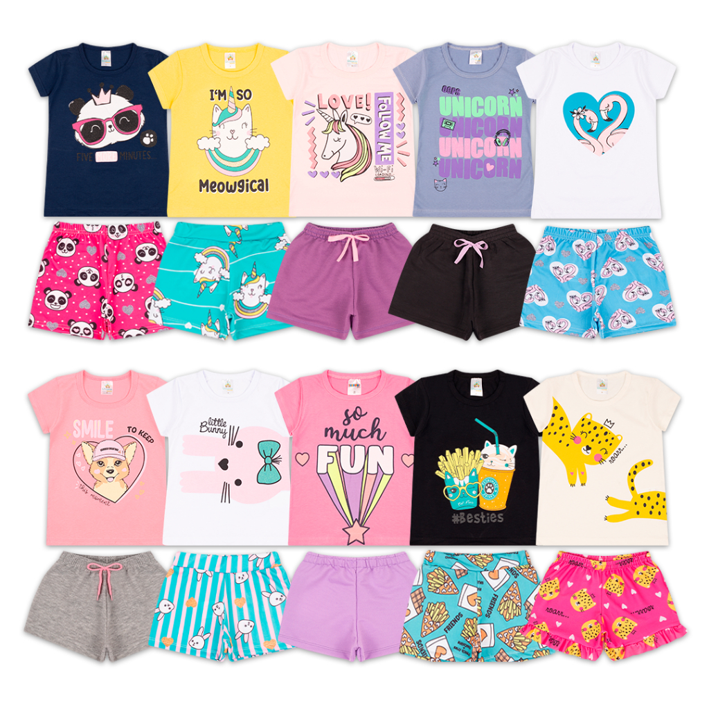 Kit 10 Peças de Roupas Infantil Sortido Menina - 5 Camisetas + 5 Bermudas - Promoção - Kit com 5 Conjuntos de Roupa Infantil Menina Verão Feminino Bebe Atacado Barato