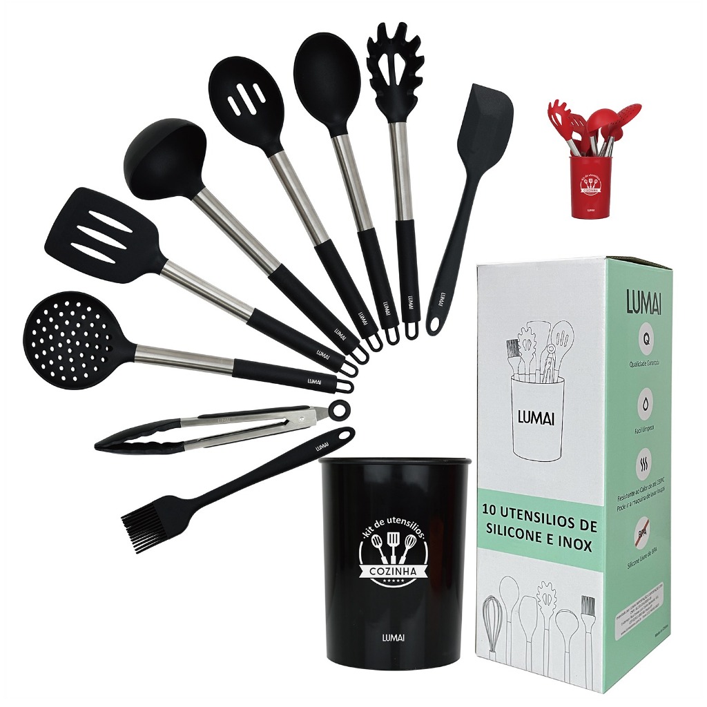 Jogo Kit 10 Utensilios De Cozinha Silicone C/ Cabo Aço Inox Balde LUMAI