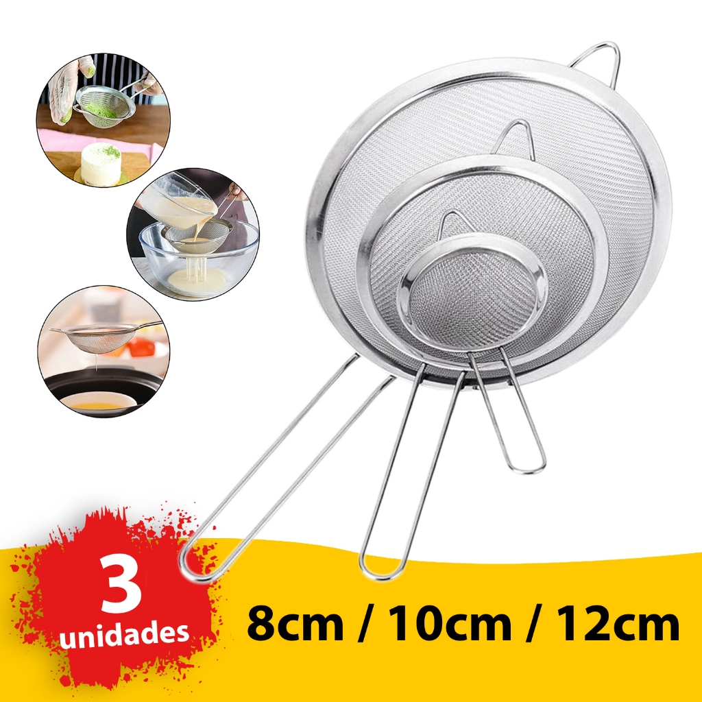 Kit 3 Peneiras Coador 8/10/12cm Aço Inox Luxo Utensílios De Cozinha Conjunto Jogo Premium Gourmet