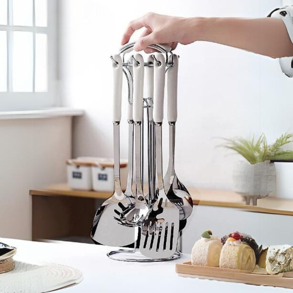Jogo de Cozinha Kit C/7 Peças de Silicone, Utensílios e Suporte para Cozinha Cabo de Madeira OU Aço Inox