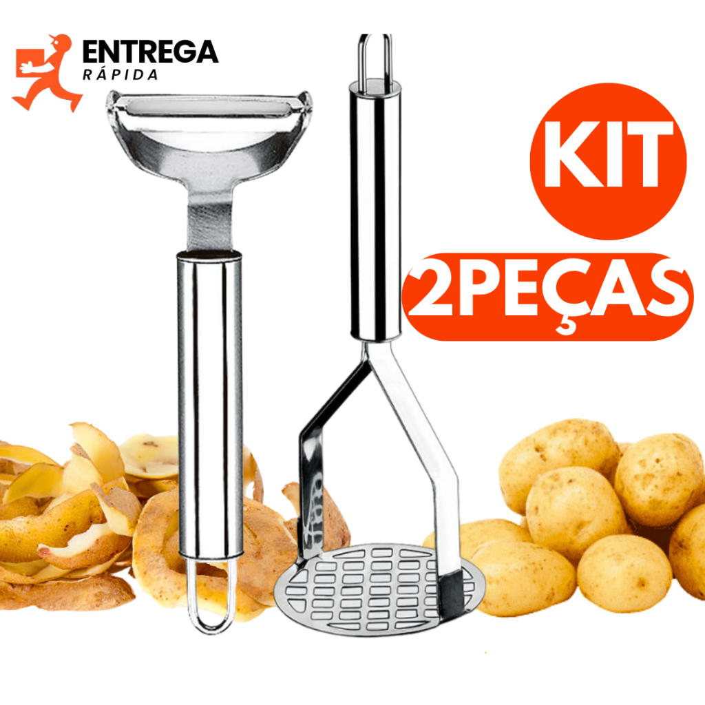 Kit 2 Peças com Descascador de Legumes e Amassador de Batatas em Aço Inox Facilite Sua Vida na Cozinha