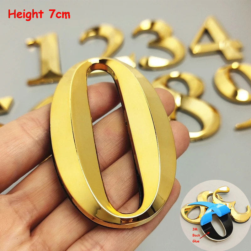Gold 3D 7CM Autocolante Número da Casa Sinal Dígito Placa para Apartamento Hotel Escritório Rua Porta