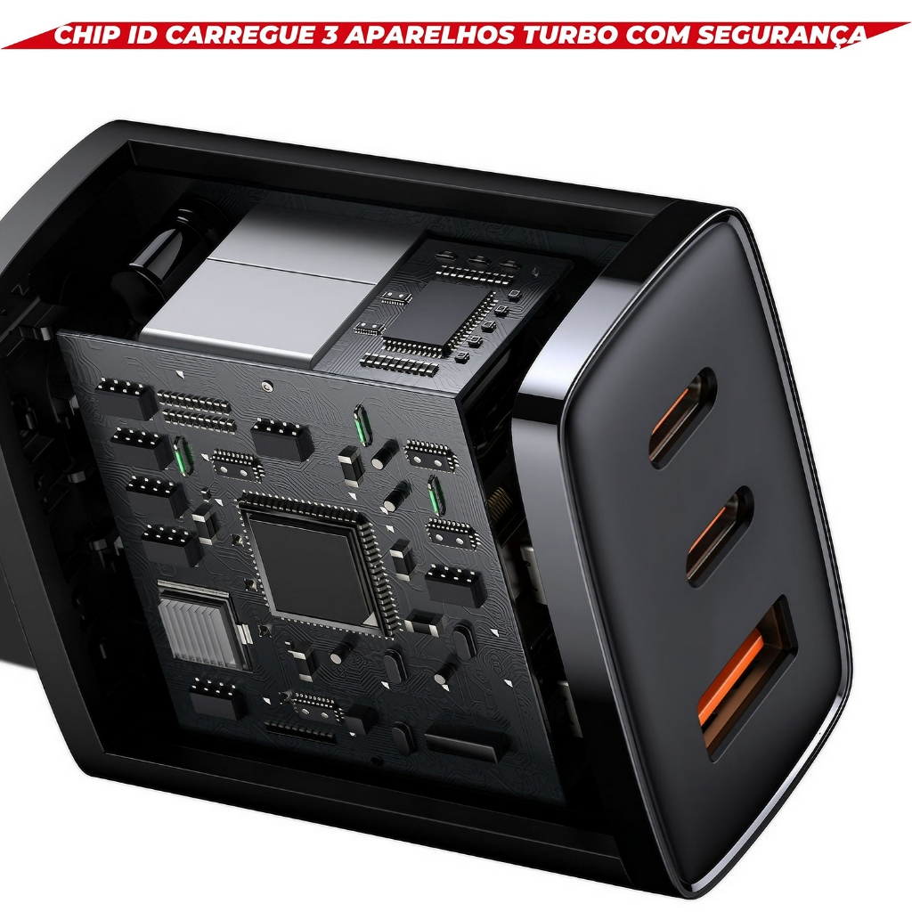 Carregador Super Rápido Turbo Baseus Gan5 Pro 65W 3 Portas Saídas 2x Tipo-C e 1x Usb Para Celular Notebook