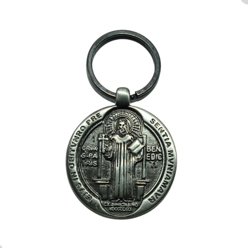 Chaveiro de São Bento Tradicional em metal prata em velhecida original com argola frente e verso em alto relevo