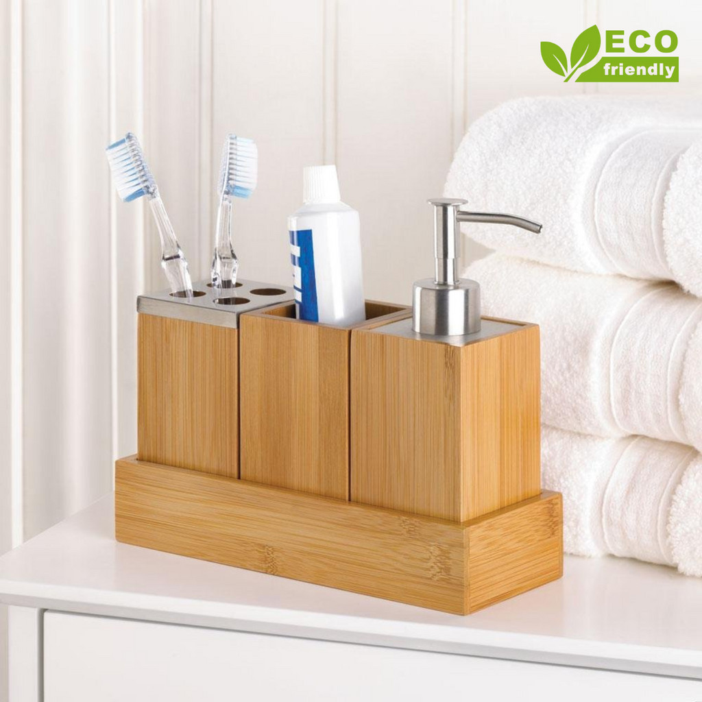 Kit Banheiro Lavabo Bambu Com Bandeja Saboneteira Escova Sabonete Liquido Luxo Moderno Completo