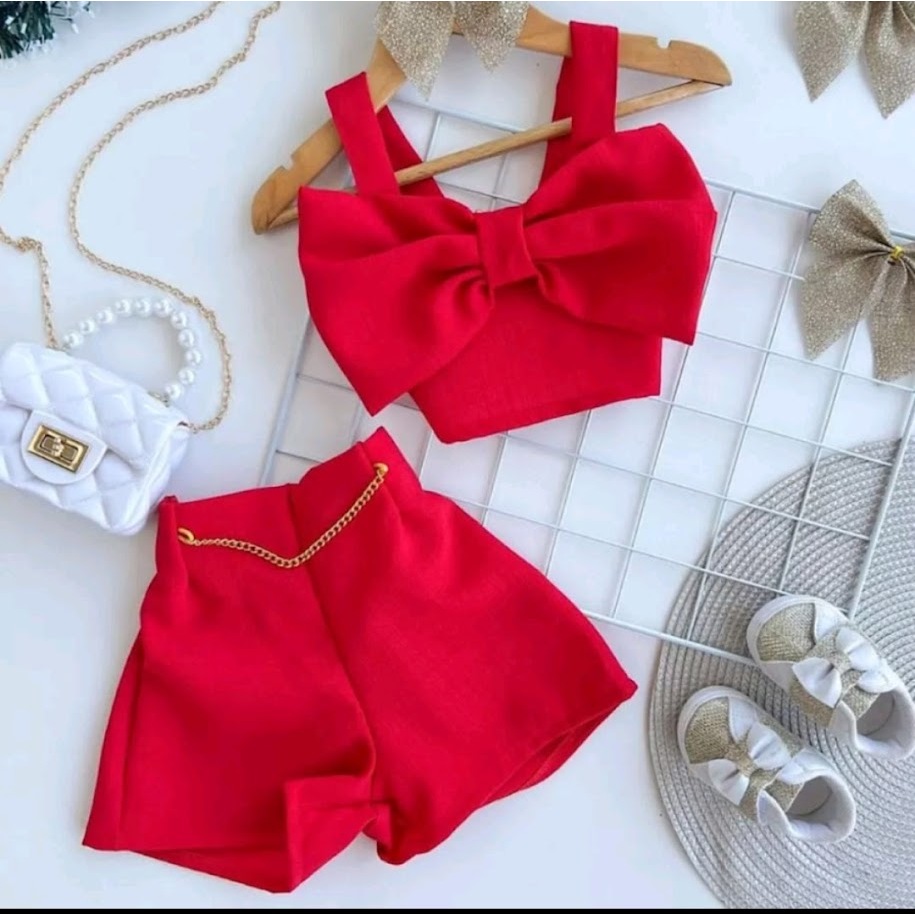 Conjunto Infantil e Juvenil Linhão Cropped Laço e Shorts Corrente (CJI002)