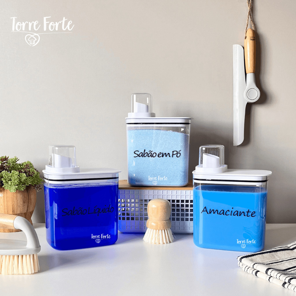 Kit 3 Potes Herméticos 1,5 L Copo Dosador Porta Sabão Pó Líquido Amaciante Lavanderia Organizador