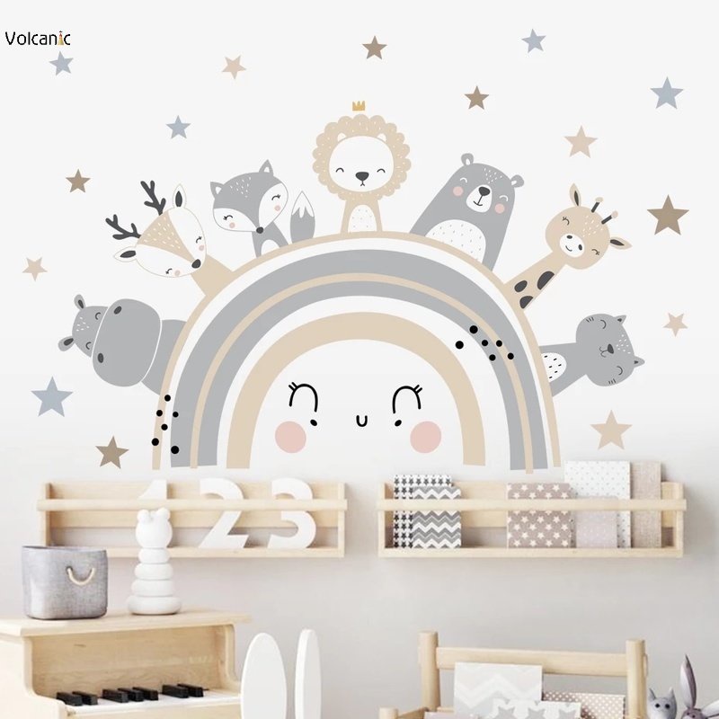 Animais De Desenho Animado Bonitos Decalques De Parede Arco-Íris Autocolantes Para Quartos Infantis Jardim De Infância Hipopótamo Leão Raposa Girafa Estrela Papel