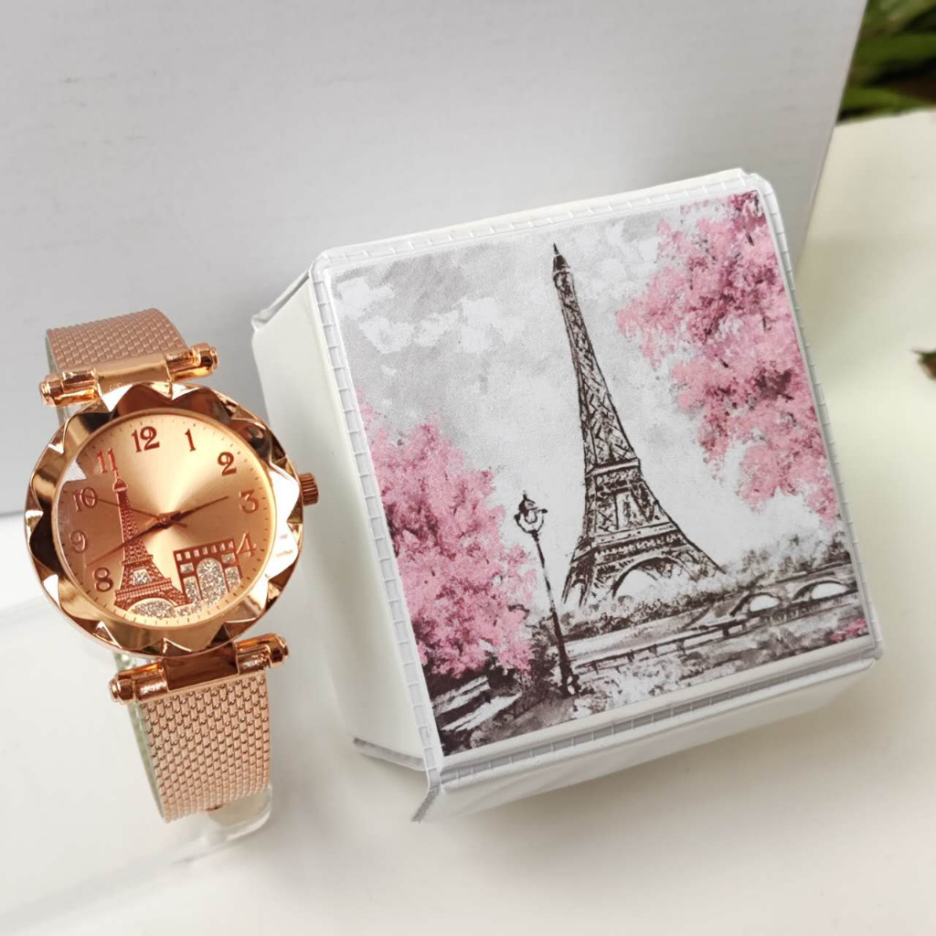 Kit com caixa Relógios Femininos de luxo Torre Eiffel Relógio de pulso para senhora presente ouro rosa preto Os relógios