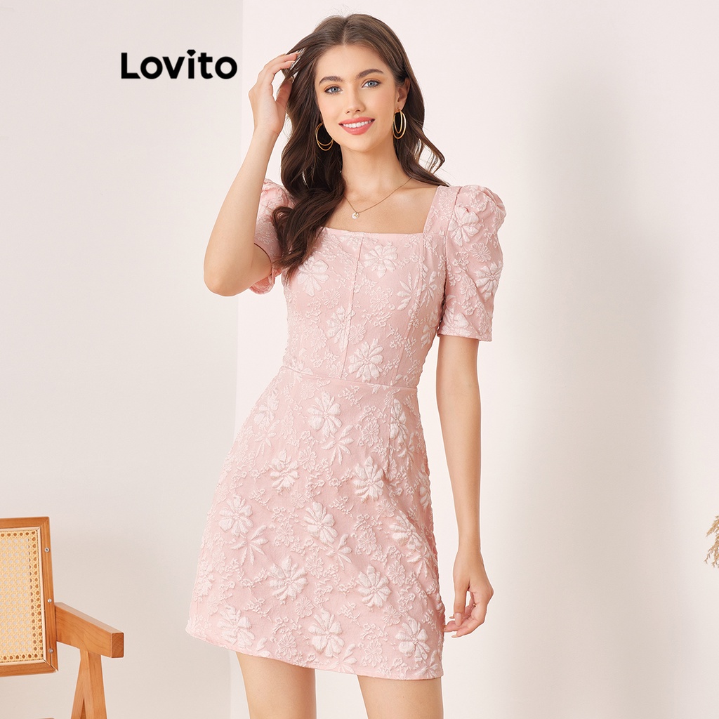Lovito Vestido Feminino Casual Com Manga Bufante Floral Em Jacquard L56ED108 (Rosa)