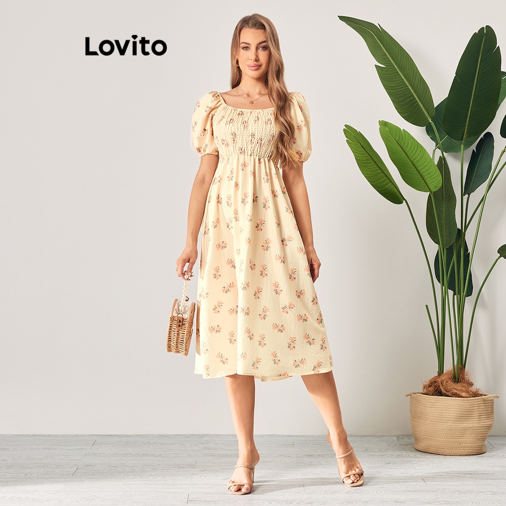 Lovito Elegante Vestido Feminino Floral Franzido com Manga Bufante e Costura L49ED115 (Amarelo Claro)
