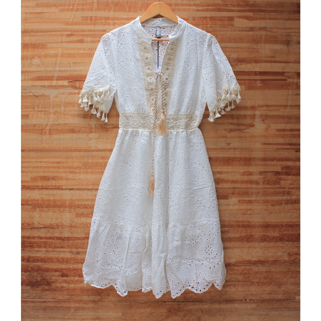 (Novo) Vestido Midi Branco Manga Curta Lasie Bordado Tassel Bege Tam M