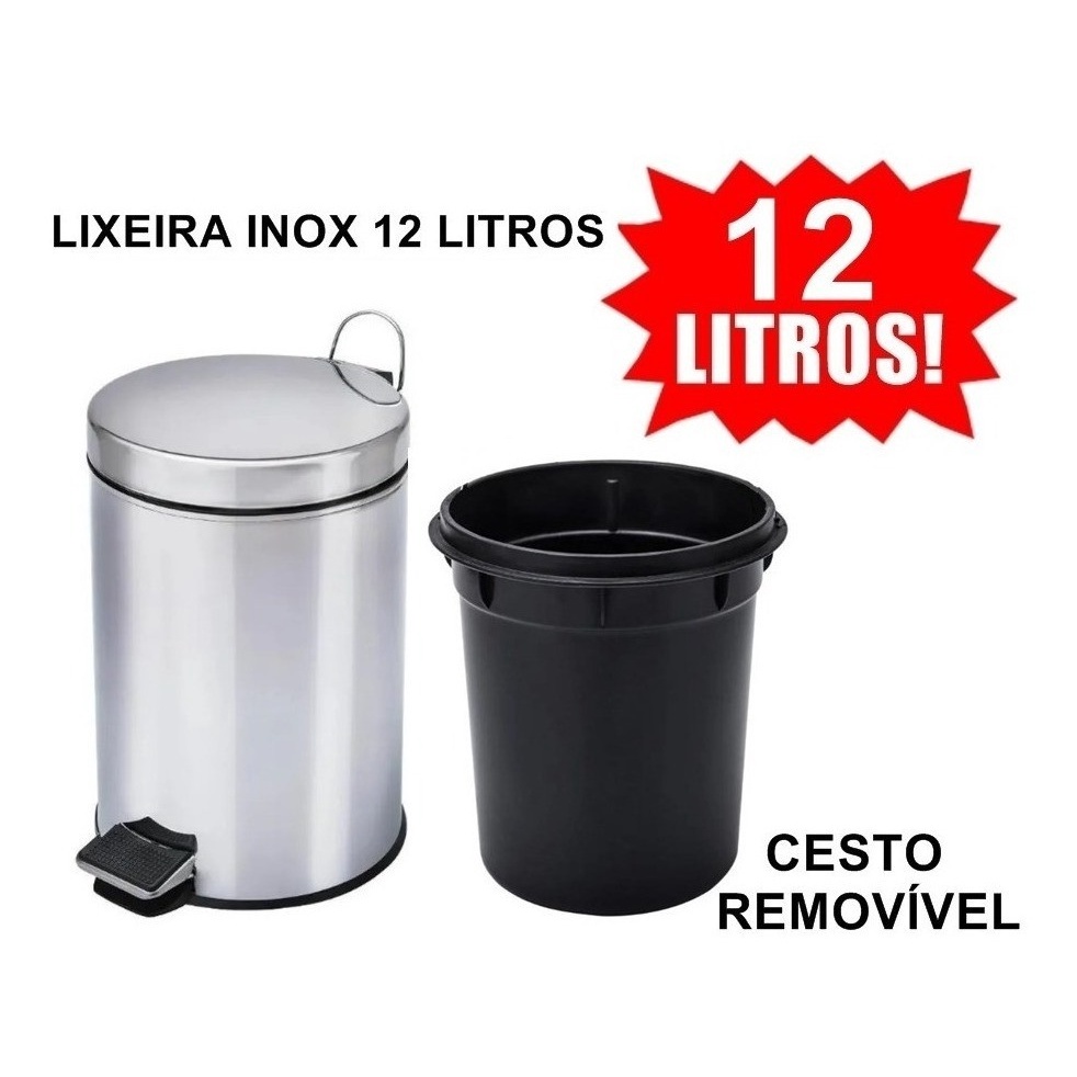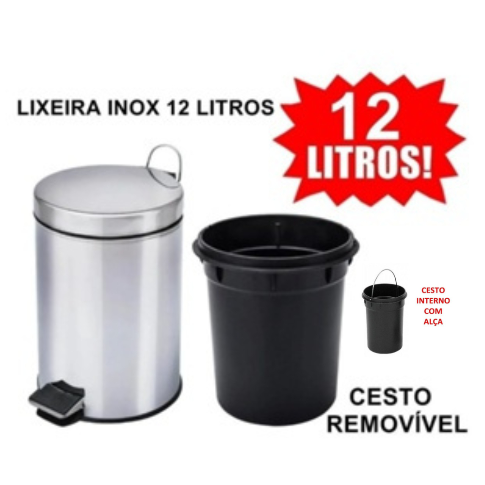 Cesto De Lixo Lixeira 12 lts 100% Inox c/ Pedal e Cesto Interno Removível