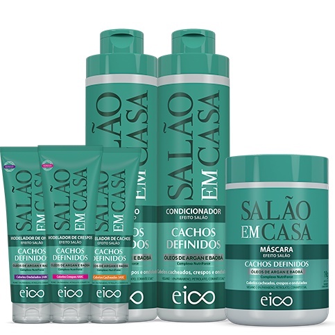 Eico Salão Em Casa Cachos Definidos Shampoo e Condicionador 800ml + Máscara Hidratação 1kg + Modelador + Spray Leave-in