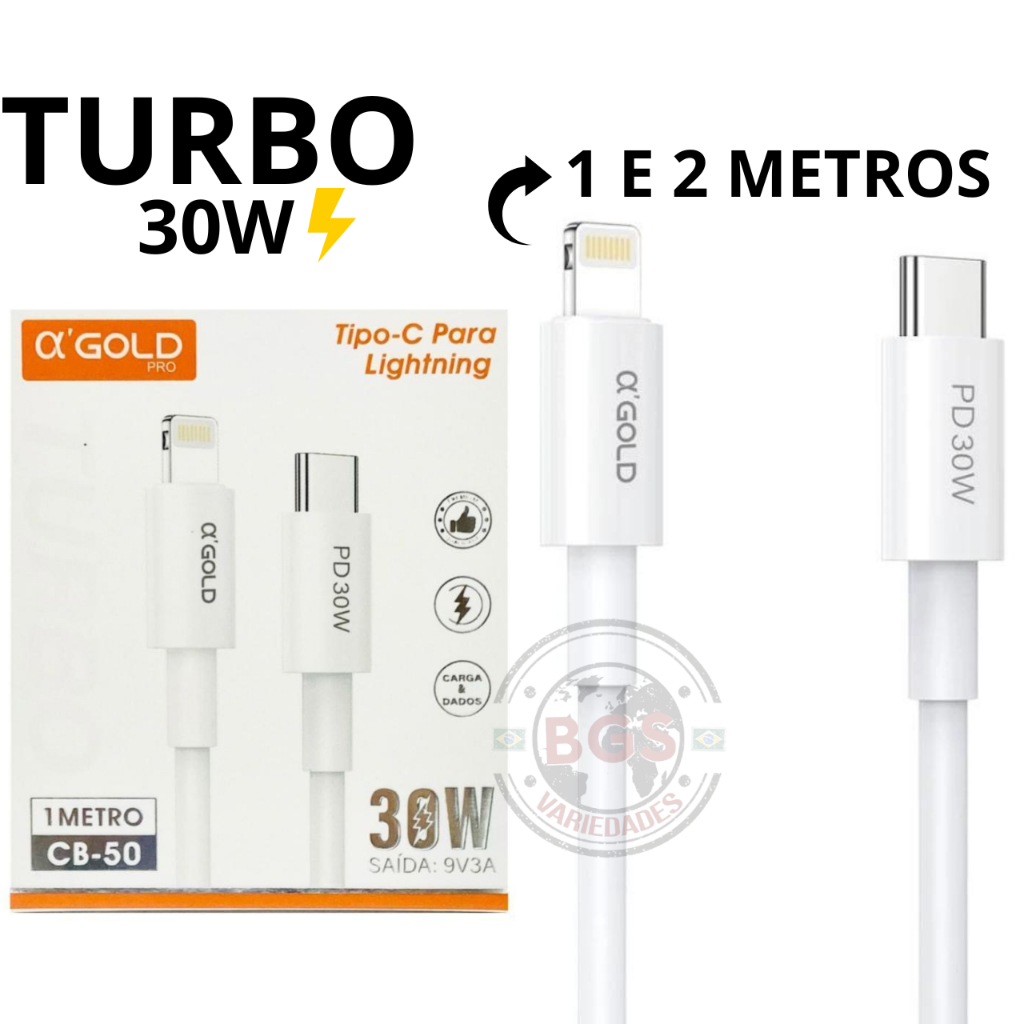 Cabo Tipo C Lightning Super Turbo 30W Para Iphone Agold Original 1 Metro 2 Metros