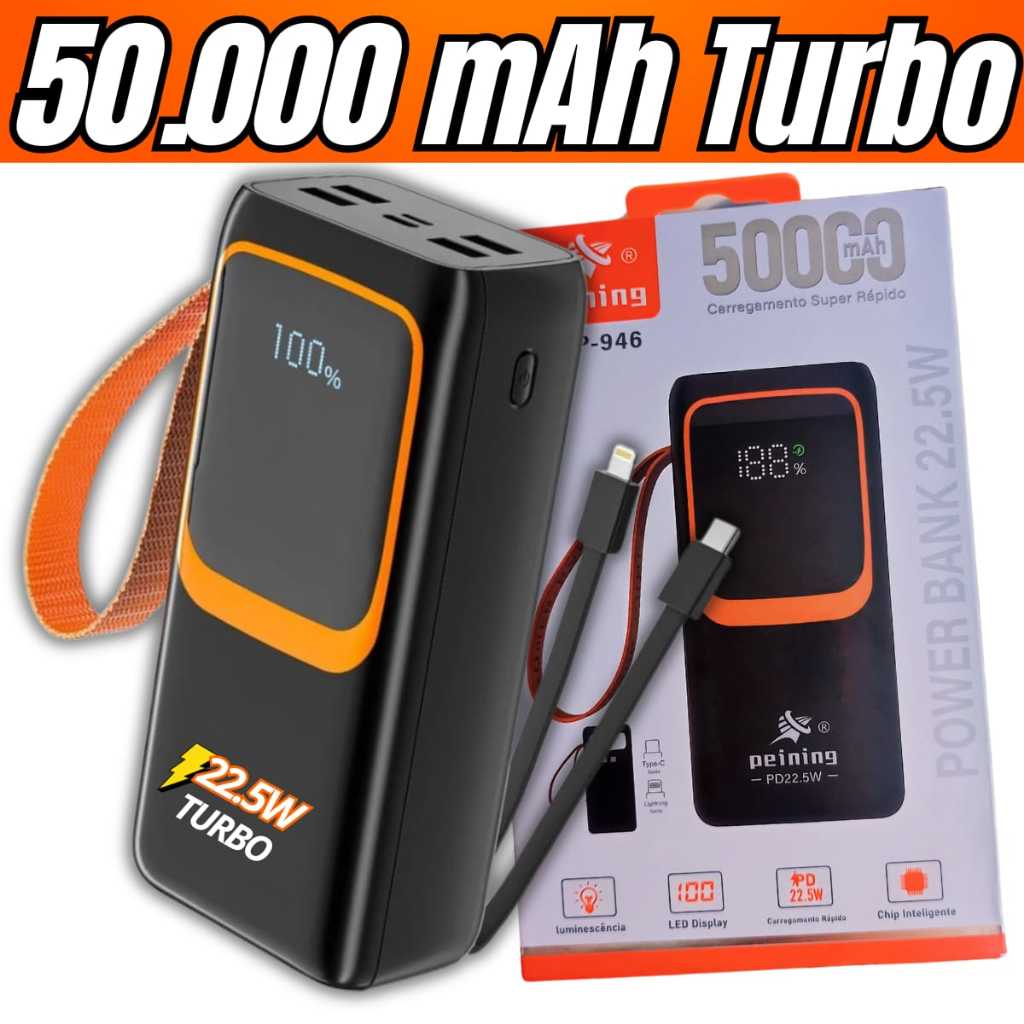 Carregador portátil Power Bank Turbo 50.000 mAh Super Rápido 22.5w Tipo c/Lightning
