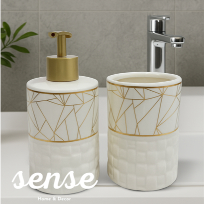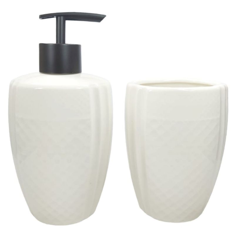Kit Jogo de Banheiro Lavabo Porcelana 2 Peças Para Decoração Com Dispenser Sabonete Líquido e Porta Escova de Dente