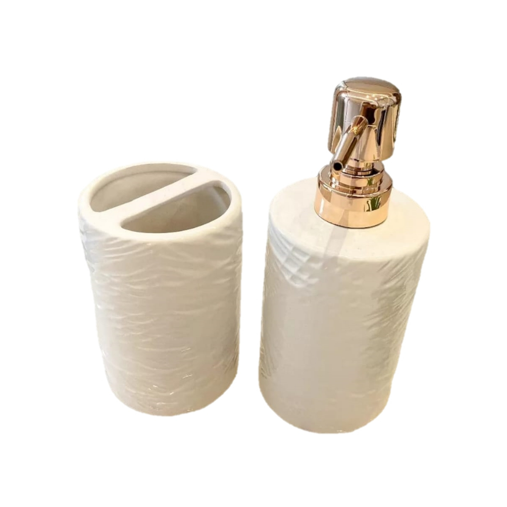 Kit 2 Peças Jogo de Banheiro Lavabo Porcelana 2 Peças Para Decoração Com Dispenser Sabonete Líquido e Porta Escova de Dente