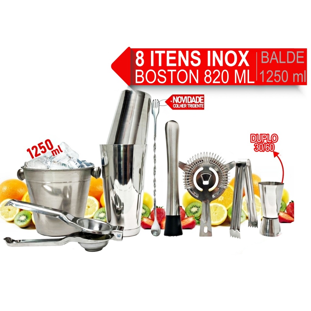 Kit Coqueteleira Boston 820 Ml com Peso - Coador Strainer Socador Colher bailarina Espremedor Baldinho Balde para Gelo Dosador Acessórios Inox Profissional