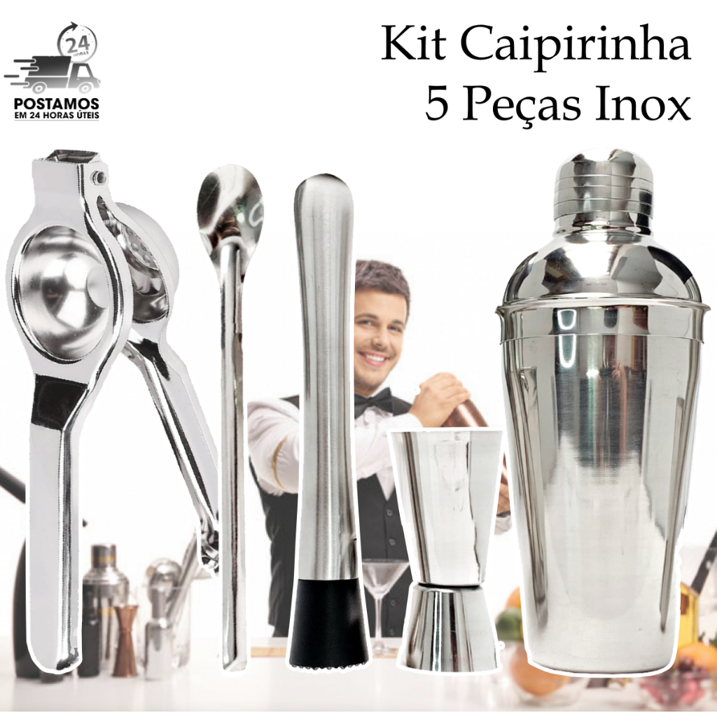 Kit Bartender Caipirinha 5 Peças Inox Espremedor limão Coqueteleira 500 ml Socador Macerador Dosador