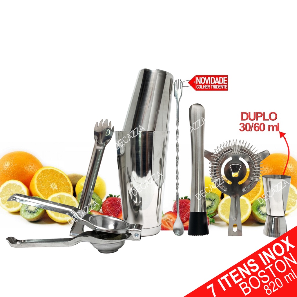 Kit com 7 Peças - Coqueteleira Boston 820 Ml Acessório Inox Profissional Socador Dosador Pegador Strainer