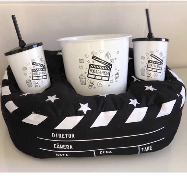 Kit almofada porta pipoca balde + 2 copos Claquete Hora da Pipoca