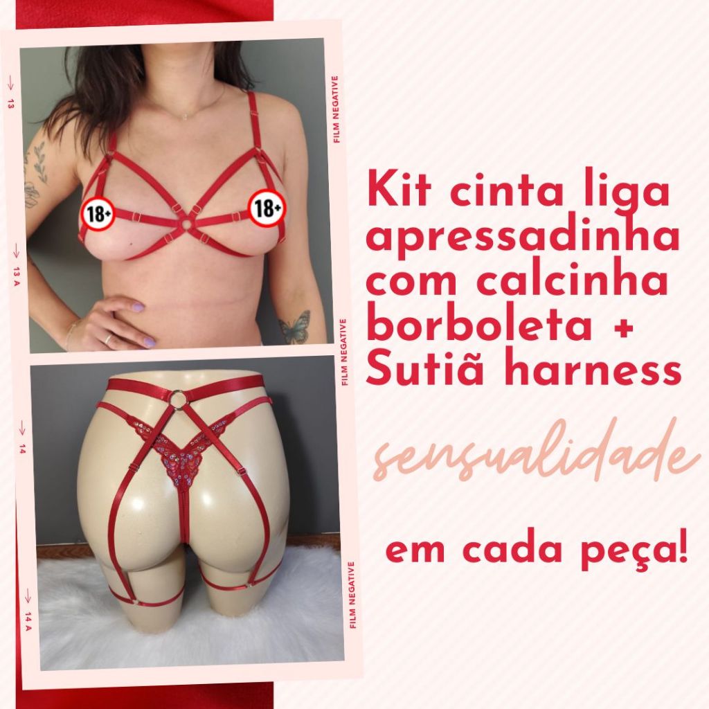 Kit cinta liga apressadinha com calcinha borboleta+sutiã harness lingerie sexy