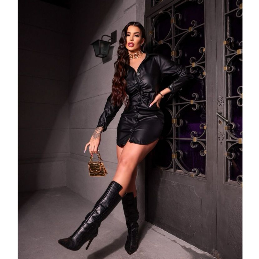 Vestido Camisão de Courino curto moda gringa manga longa elegante para balada e festas