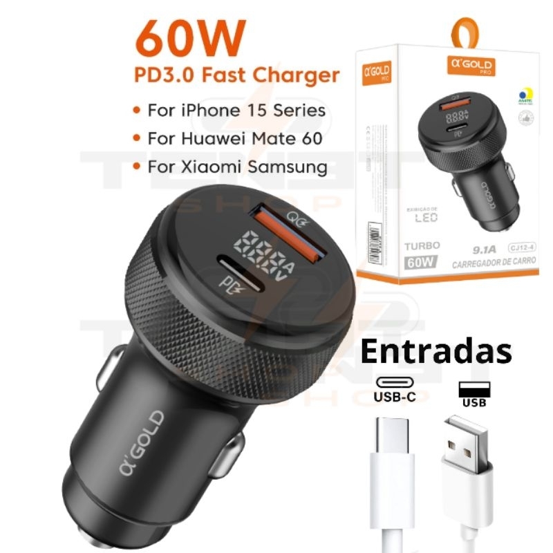 Carregador Veicular 60W Turbo USB e Tipo C Led Fonte Carro Automotivo Original