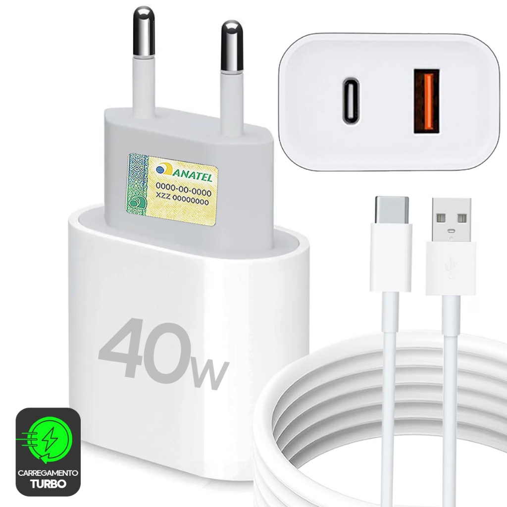 Carregador Tipo C 40W Super Turbo Fonte 2 Entradas USB e USB-C + Cabo Usb-C Rápido Samsung, Motorola, Xiaomi, Notebooks