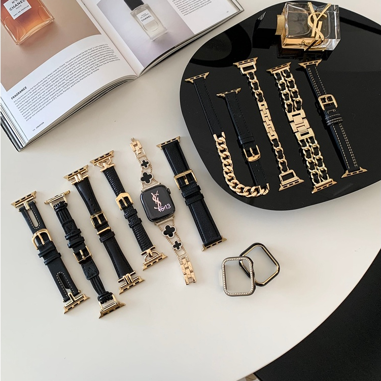 Pulseira De Couro Genuíno Série Ouro Preto Para Relógio Apple Ultra 49mm 45mm 44mm 41mm 40mm metal iwatch Séries 9 8 7 6 5 SE 4 3 2 Capa