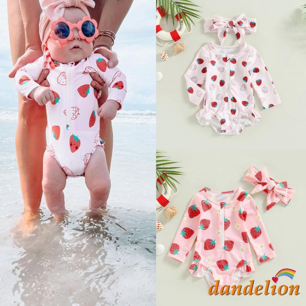 Dandelion-6 Meses-3 Anos Bebezinha Morango Estampa Zíper Roupa De Banho + Banda De Cabeça