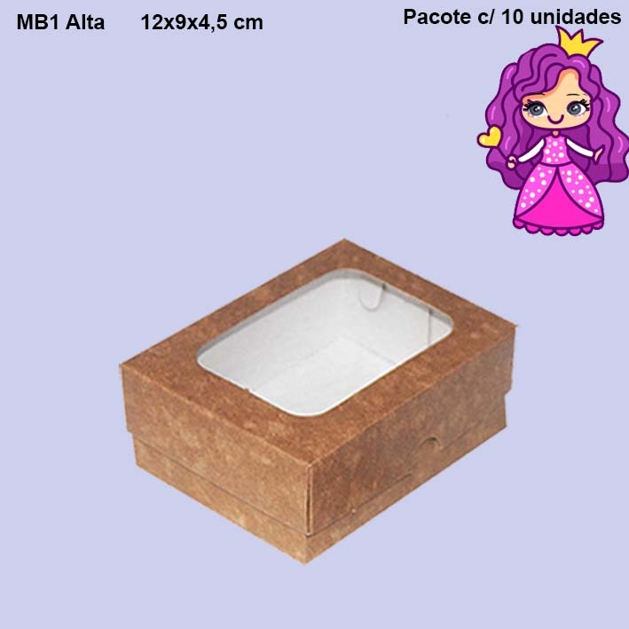 Embalagem MB1 Alta com Visor em papel Kraft - 12x9x4,5 cm - Pacote com 10 unidades