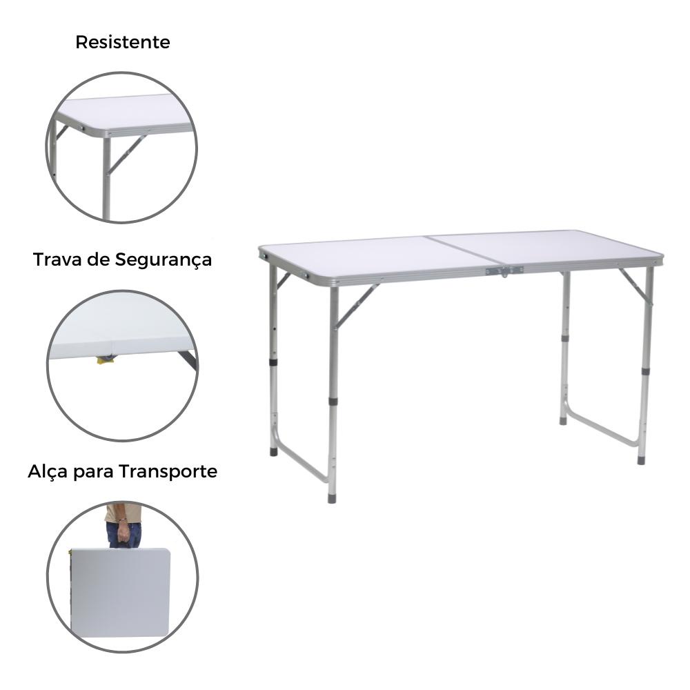 Mesa Dobrável De Alumínio Com Tampo De Mdf Que Vira Maleta Com Alça Para Camping Praia Churrasco 120X60cm Branco