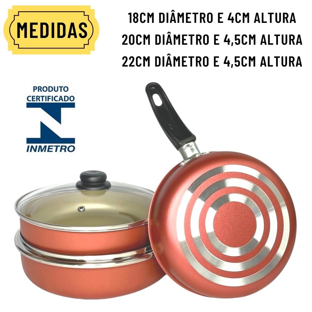 Kit Conjunto Frigideira Antiaderente Com Tampa De Vidro Jogo com 3 Peças Teflon