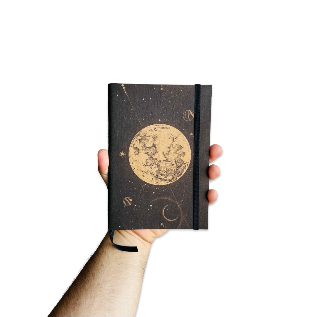 Sketchbook Caderno Desenho Lua Cheia Céu Estrelado com Elástico e Marca Página Aquarela