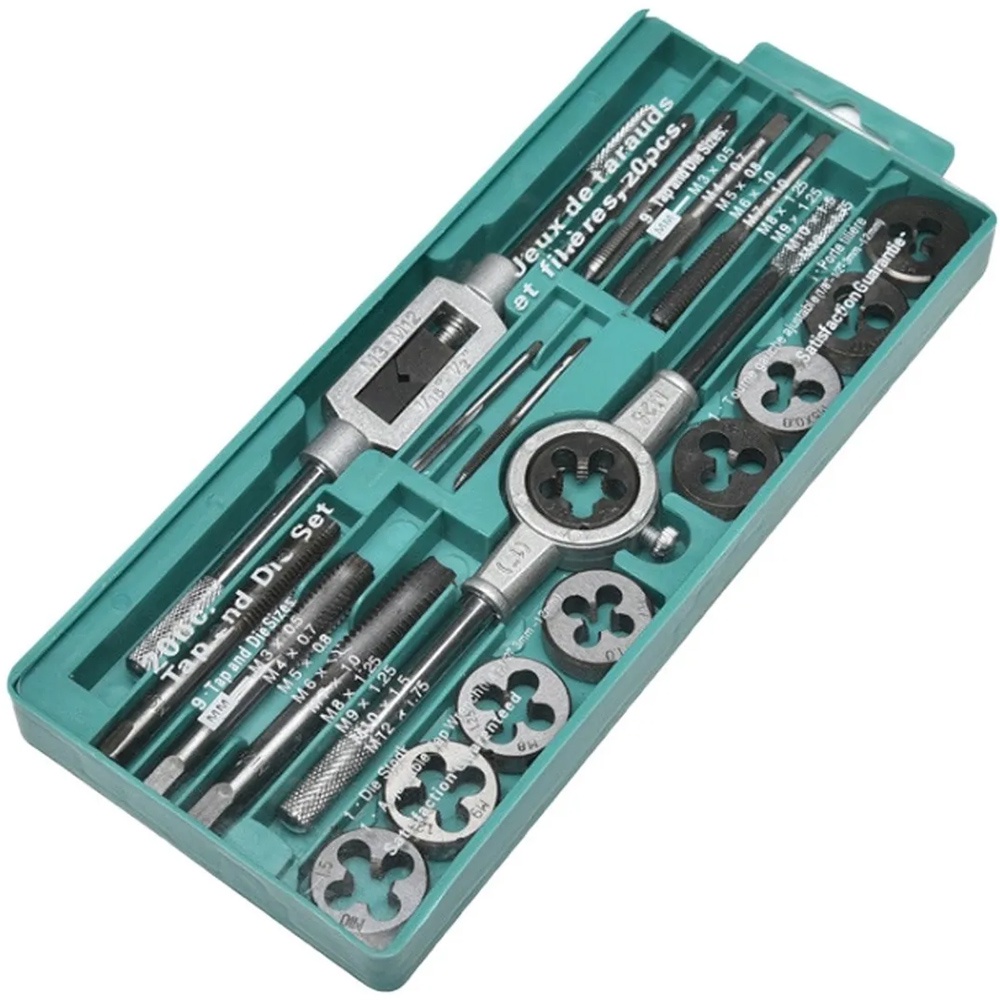 Jogo 20 Peças Em Aço Carbono Com Estojo De Tarraxas e Cossinetes Para Fazer Rosca Macho E Fêmea