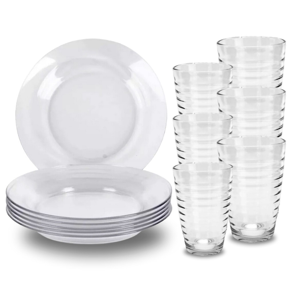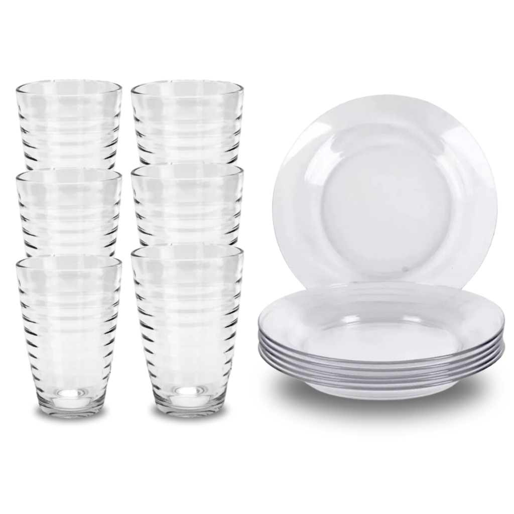 Jogo De Prato Fundo e 6 Copos de Vidro Arizona Transparente Kit 12 Unidades