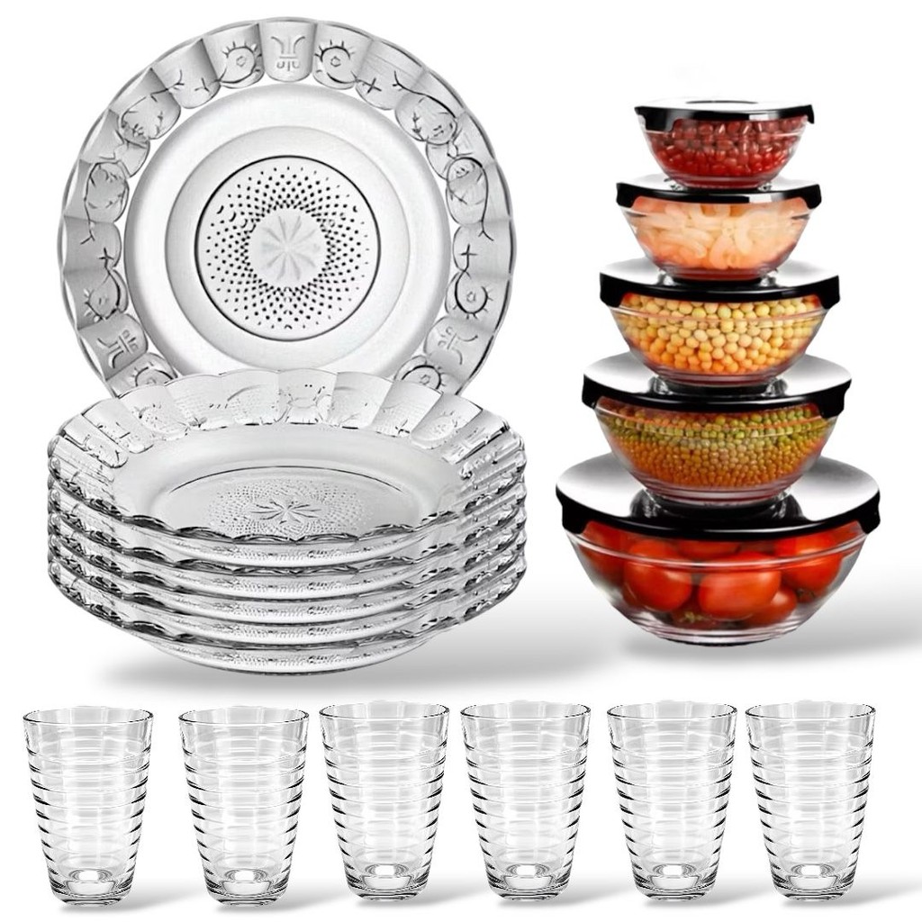 Jogo De Prato Fundo De Vidro Egípcio 6 Copos De Vidro Arizona + Pote Redondo com Tampa 5 Unidades Tigela Vidro Bowl