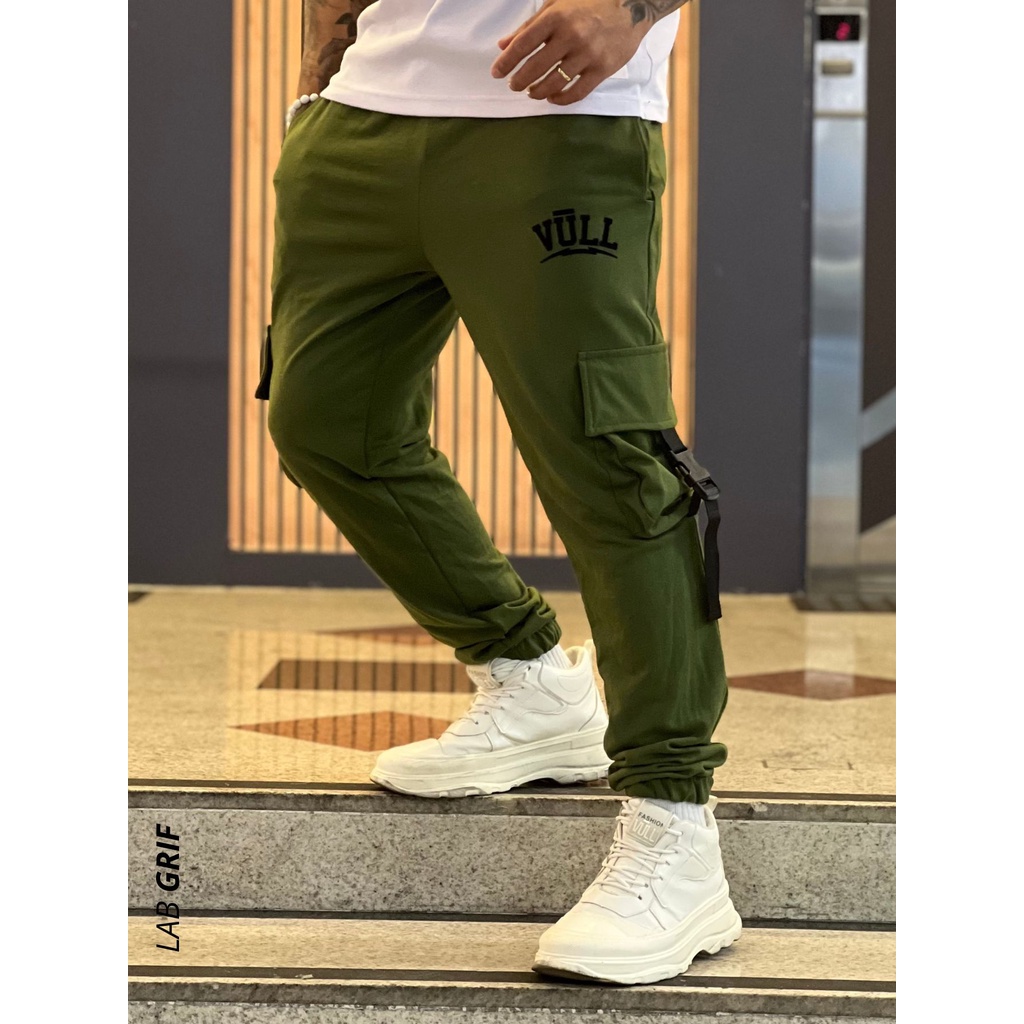 Homens Calça Cargo Masculina Vull Jogger Sofisticada Edição Limitada Verde Militar estampa em veludo premium Moletinho G