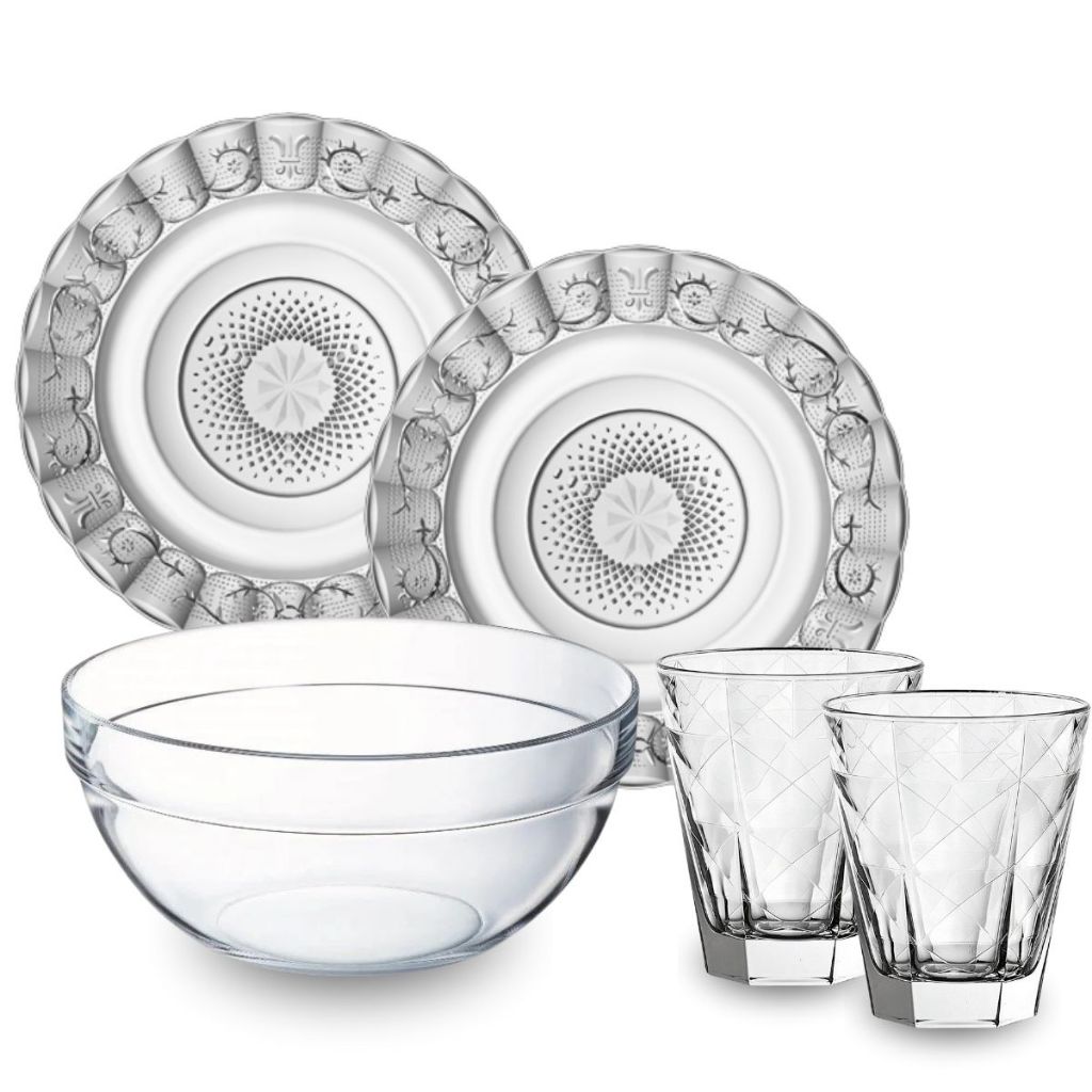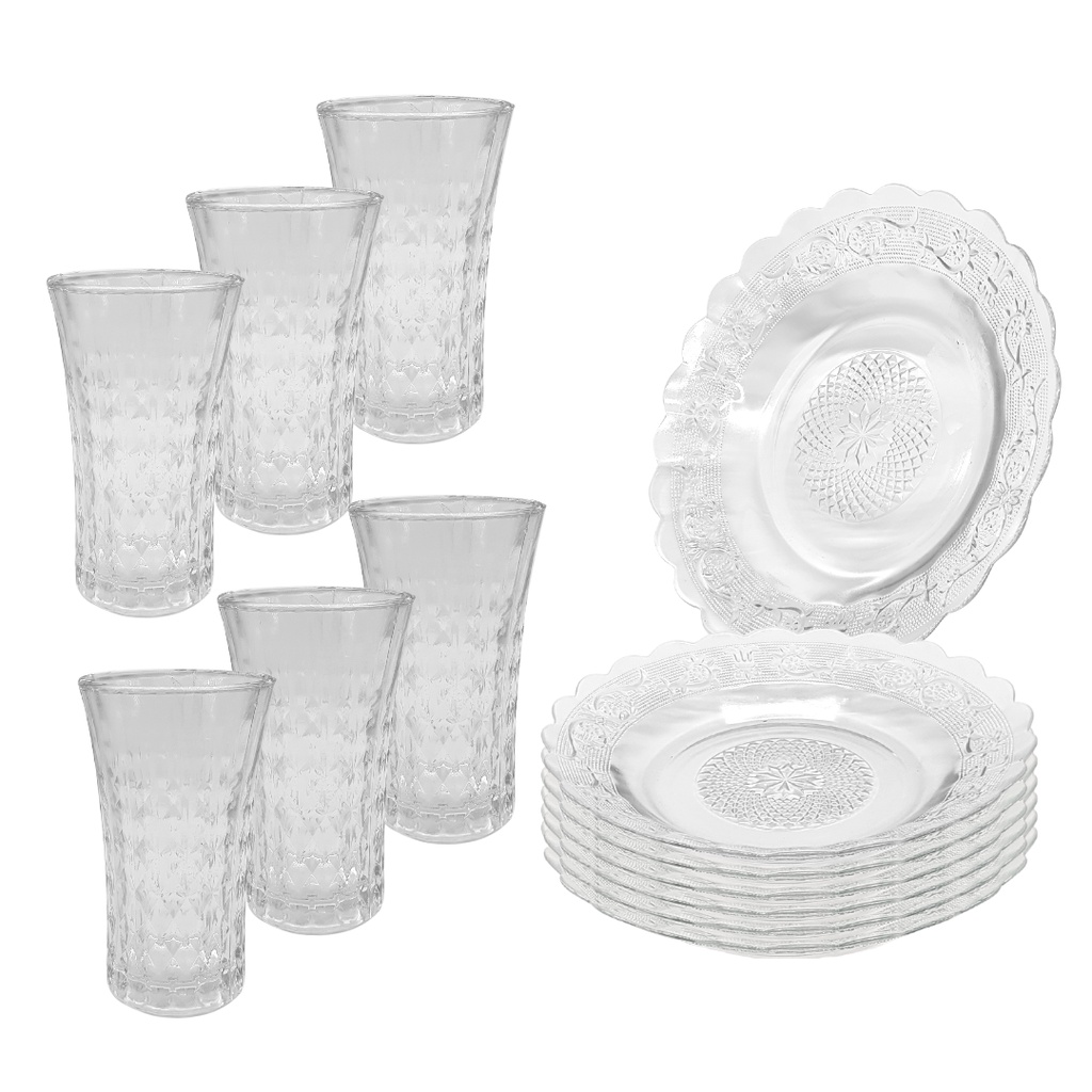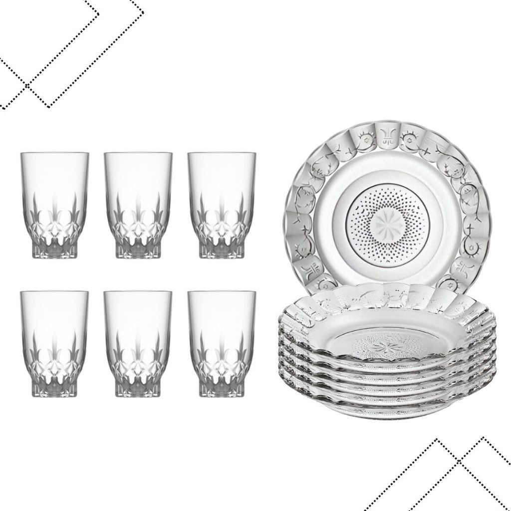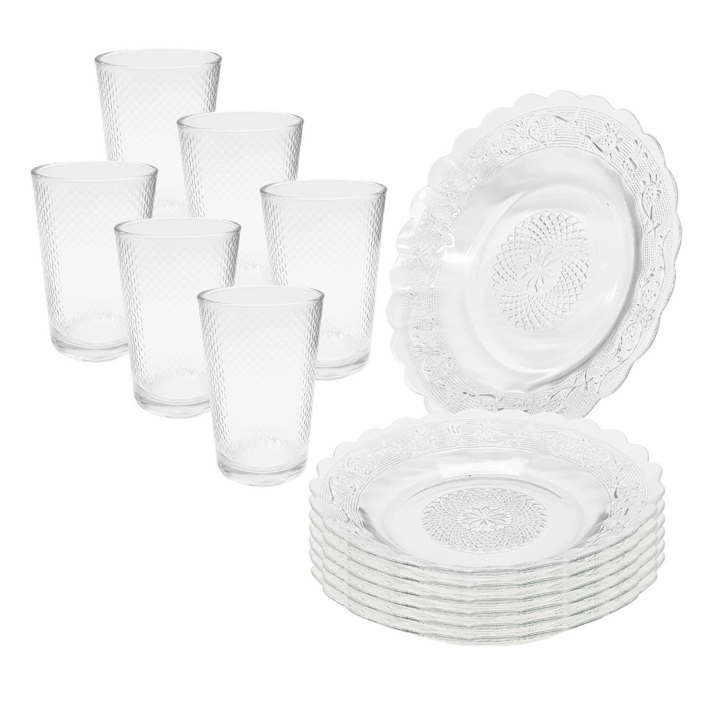 Jogo 12 Peças Aparelho de Jantar 6 Pratos Fundo Vidro + 6 Copos Diamond