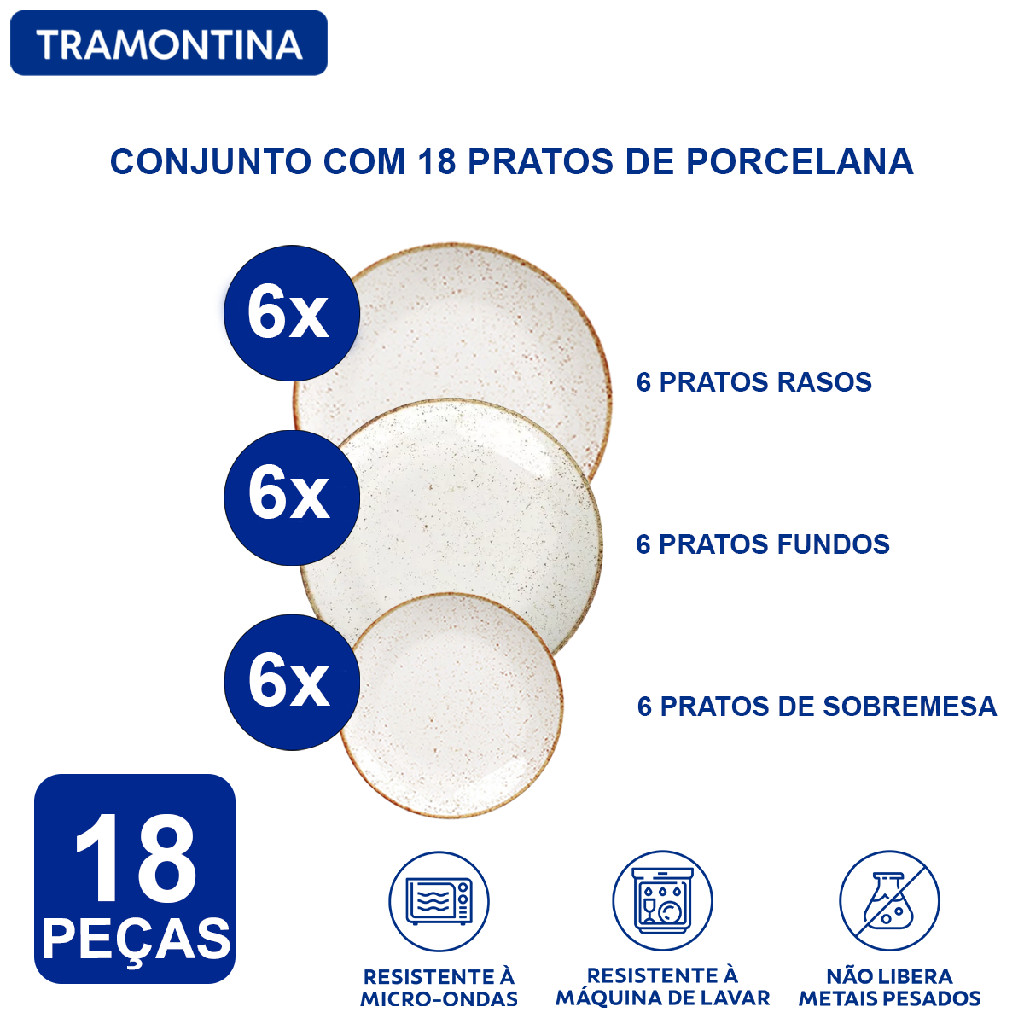 Aparelho de Jantar Jogo de Pratos Rasos, Fundos e Sobremesa Tramontina Rústico Marrom Porcelana Decorada 18 Peças