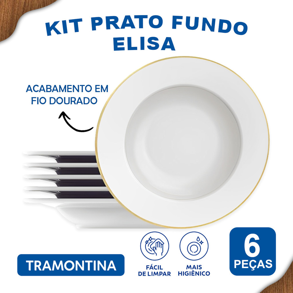 Aparelho De Jantar Jogo de Pratos Fundos Filetado 23 cm Tramontina Elisa em Porcelana com Borda Dourada 6 Peças