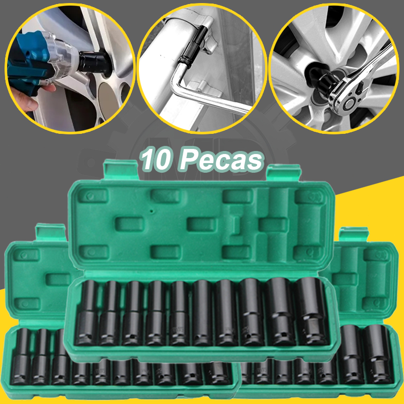 Jogo de Soquetes de Impacto Longo 1/2 10 Peças 8 A 24mm Soquete Sextado
