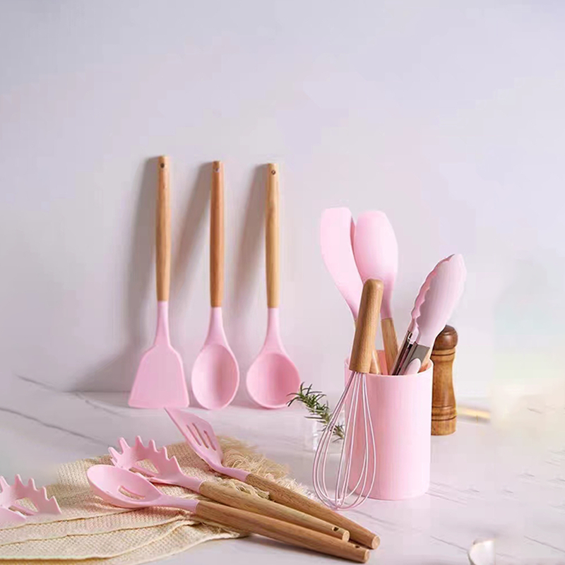 KIT de Utensílios Para Cozinha em Silicone e Bambu 12 Peças Jogo de colheres