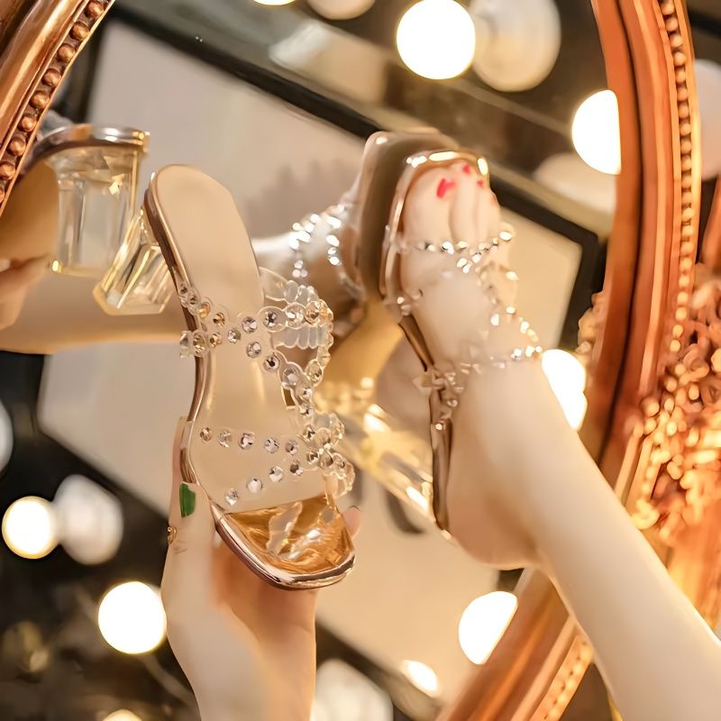2023 Sandálias Chinelos Mulheres Vestem Fada Estilo Ano Novo Influenciador de Verão Rebites de Salto Alto Transparentes de Salto Grosso